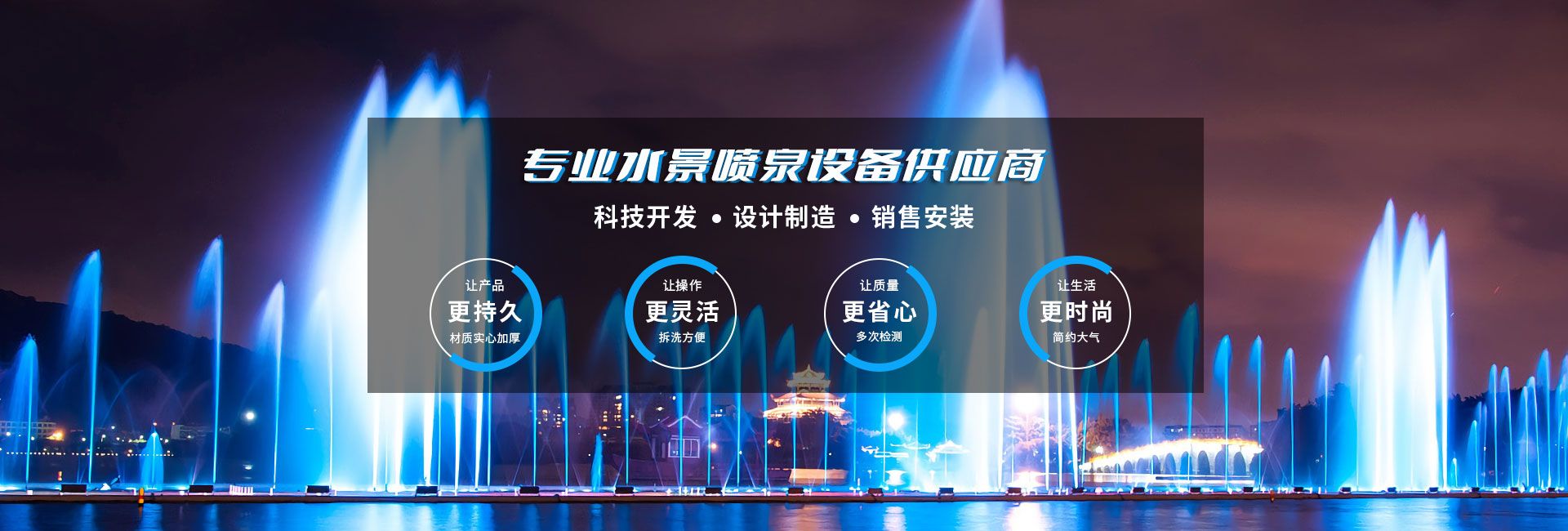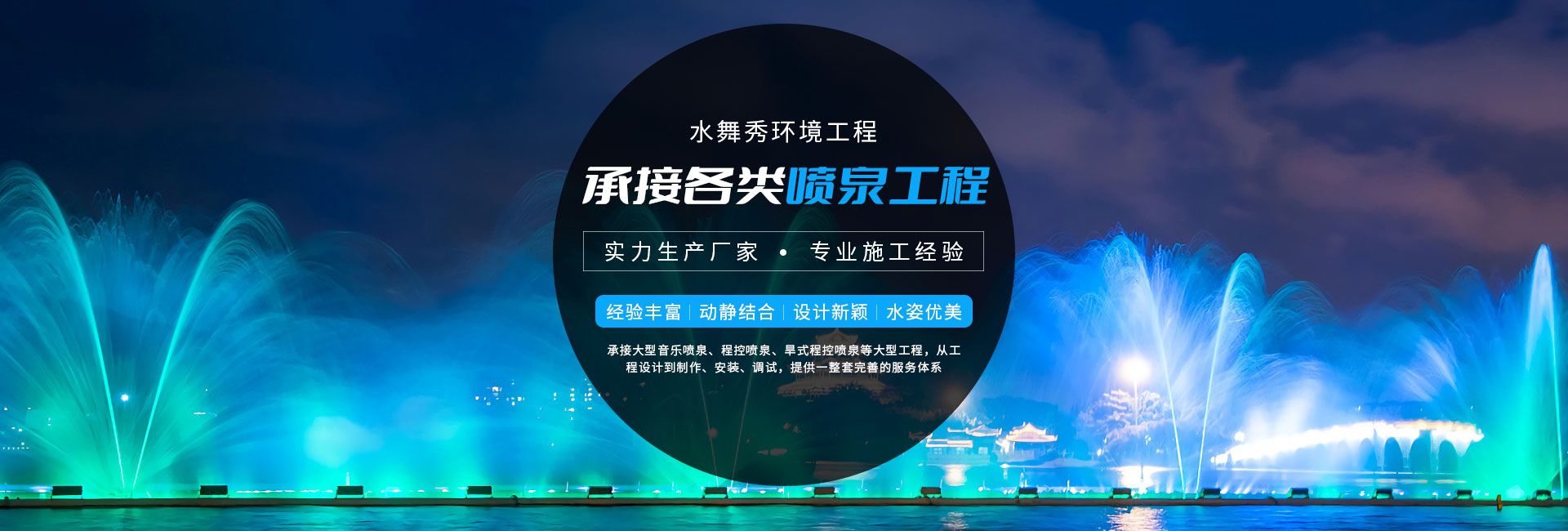 無(wú)錫市水舞秀環(huán)境工程有限公司,位于美麗的太湖之濱,著名的陶都--宜興。342省道附近,交通十分便利。本公司立志于弘揚(yáng)水文化,做好水文章,使噴泉水景集聲、光、水三維一體,營(yíng)造出更奇、更新、更美的人文景觀。公司在全國(guó)承接了大型音樂(lè)噴泉、程控噴泉、旱式程控噴泉等大型工程,從工程設(shè)計(jì)到制作、安裝、調(diào)試,提供一整套完善的服務(wù)體系只要客戶想到,我們一定能做到、做好。水舞秀噴泉匯聚了噴泉界一批有名望的設(shè)計(jì)專家,培養(yǎng)和造就了一大批富有實(shí)際經(jīng)驗(yàn),誠(chéng)實(shí)守信、吃苦耐勞的高素質(zhì)員工隊(duì)伍...